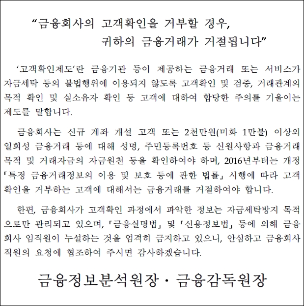 2016년부터 고객확인 거부 시 금융거래가 거절됩니다.