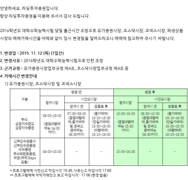 대학수학능력 시험일(2015.11.12)(목) 매매거래시간 변경 안내
