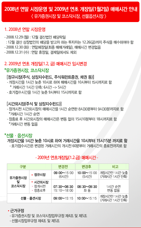 2008년 말~2009년 초 장 운영시간 안내 (코스피,코스닥,선/옵시장)